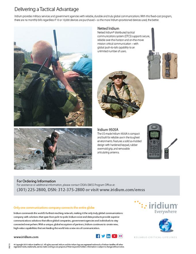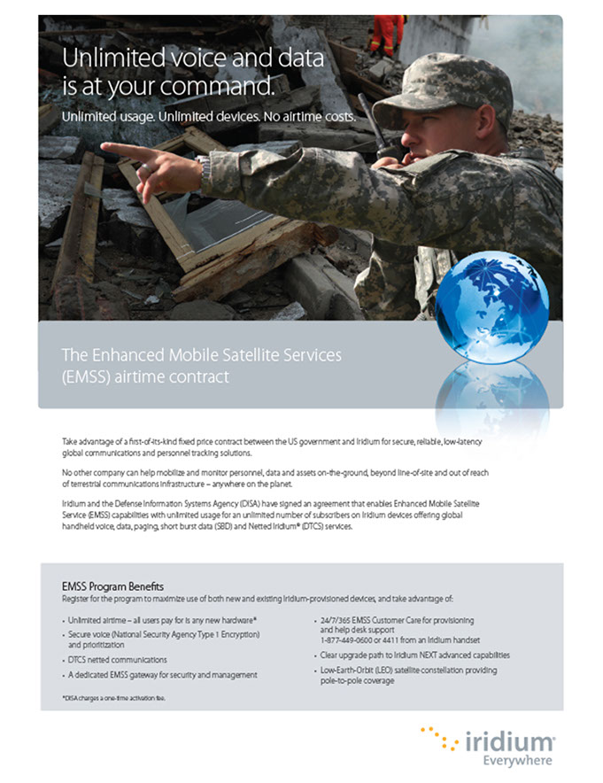 Take advantage of a first-of-its-kind fixed-price contract between Iridium and the Defense Information Systems Agency (DISA) enabling Enhanced Mobile Satellite Services (EMSS) capabilities with unlimited usage for unlimited subscribers on Iridium devices. Benefit from global handheld voice, data, paging, Short Burst Data (SBD) and Netted Iridium® (DTCS) services.