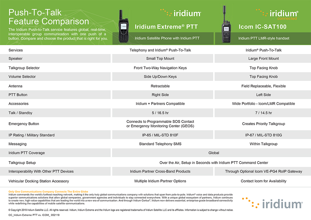 The Iridium® Push-to-Talk service features fast, simple, real-time, interoperable group communication with one push of a button. The Iridium PTT portfolio, including Iridium Extreme® PTT and Icom’s IC-SAT100, provides the power of global push-to-talk for even the most uncompromising operating environments.